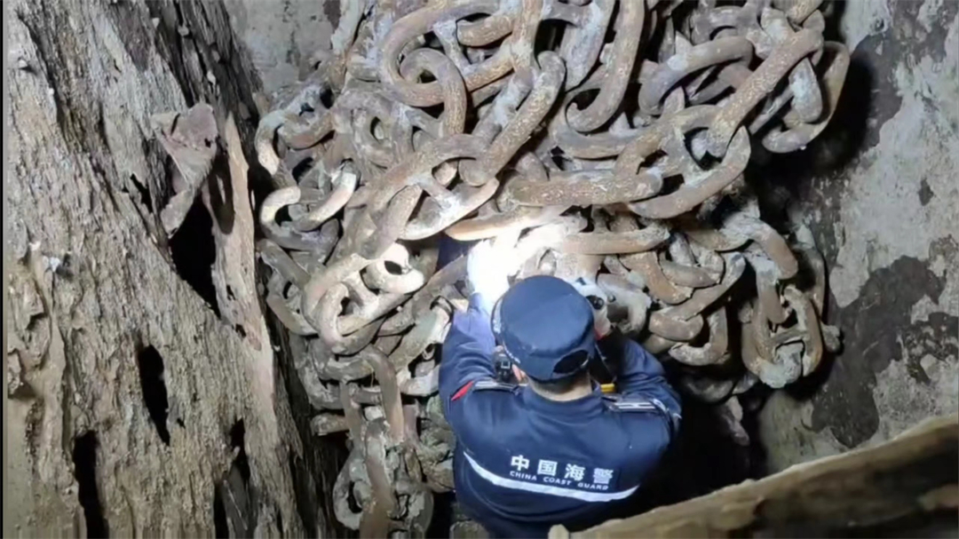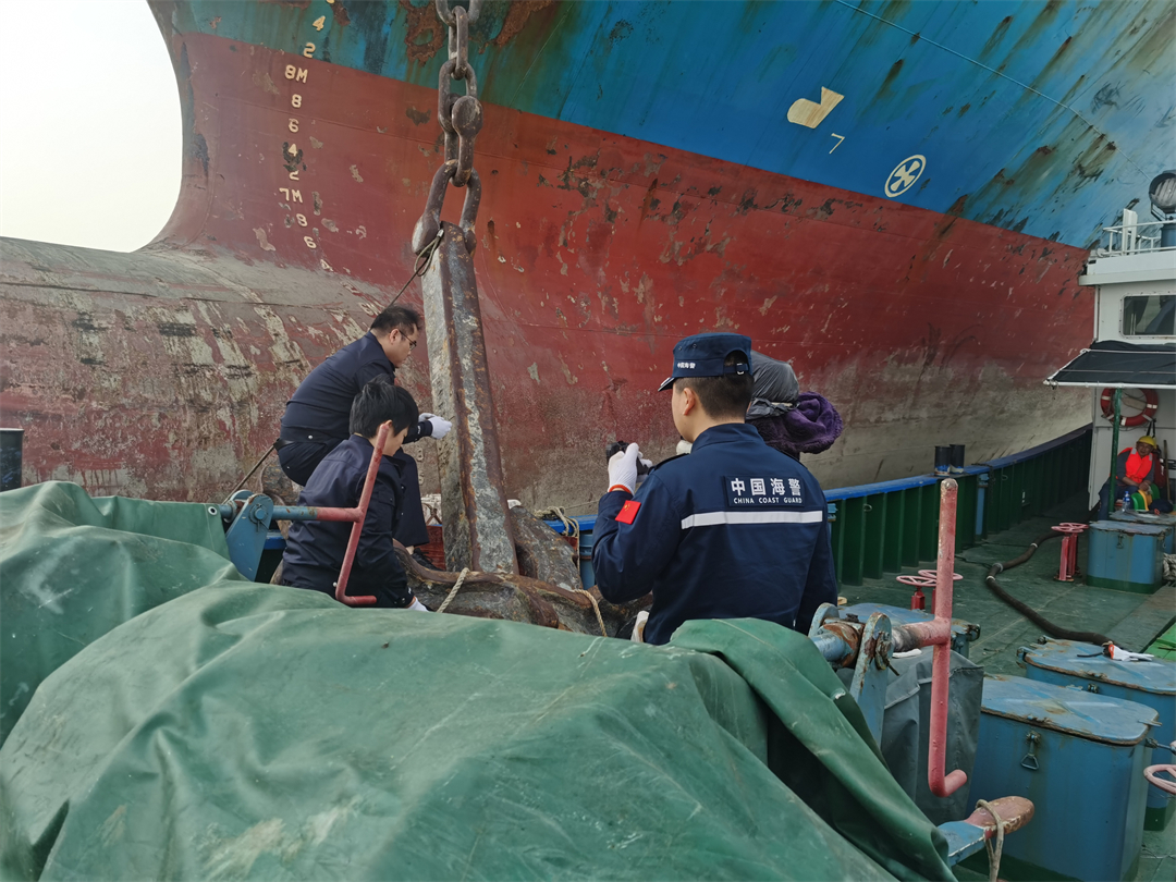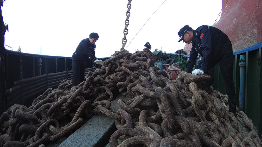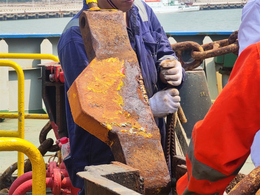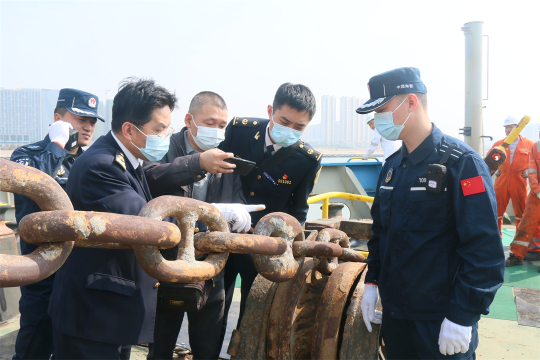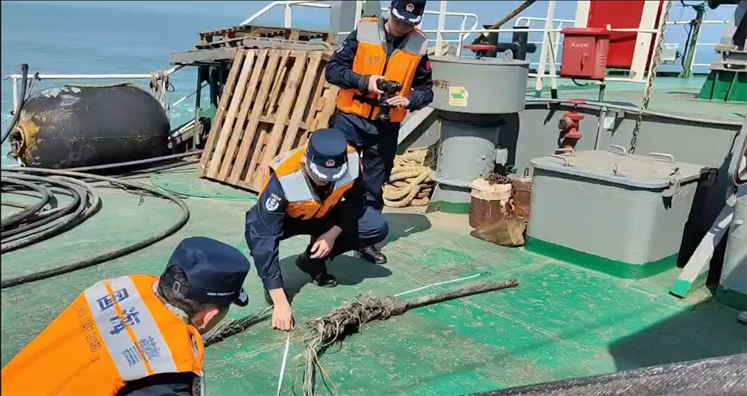 圖為廣東海警局與海事局工作人員對(duì)海纜案涉案船舶錨鏈進(jìn)行檢查。