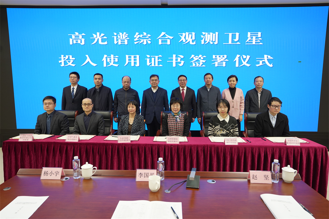 1月23日,國家航天局在京舉辦高光譜綜合觀測(cè)衛(wèi)星投入使用儀式。國家航天局總工程師李國平出席儀式。生態(tài)環(huán)境部、自然資源部、中國氣象局、中國航天科技集團(tuán)有限公司等單位代表出席儀式并共同簽署了高光譜綜合觀測(cè)衛(wèi)星投入使用證書。