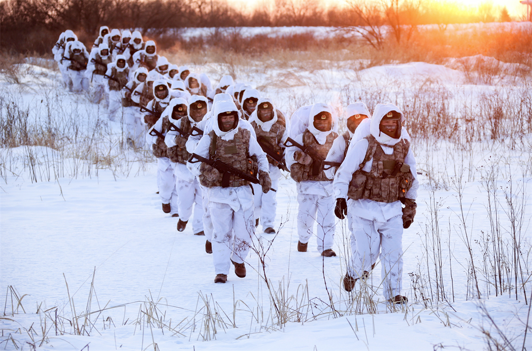 圖為陸軍某邊防旅“東方第一哨”官兵冒著嚴(yán)寒組織徒步行軍。