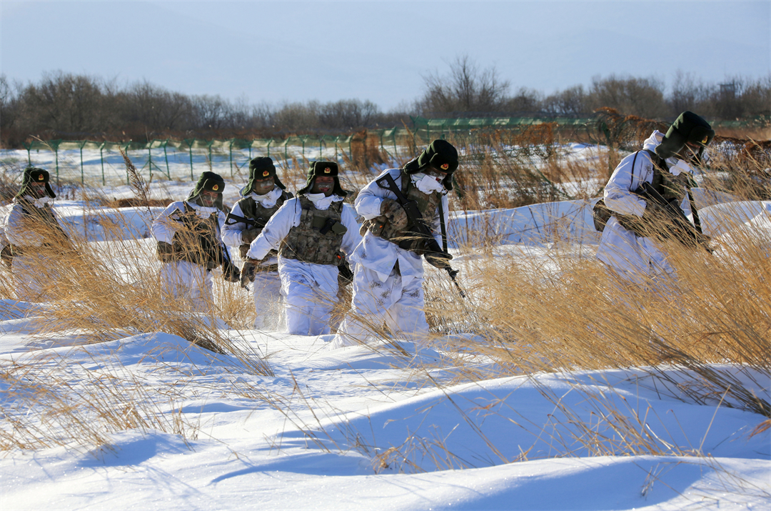 圖為陸軍某邊防旅“東方第一哨”官兵冒著嚴(yán)寒巡邏執(zhí)勤。
