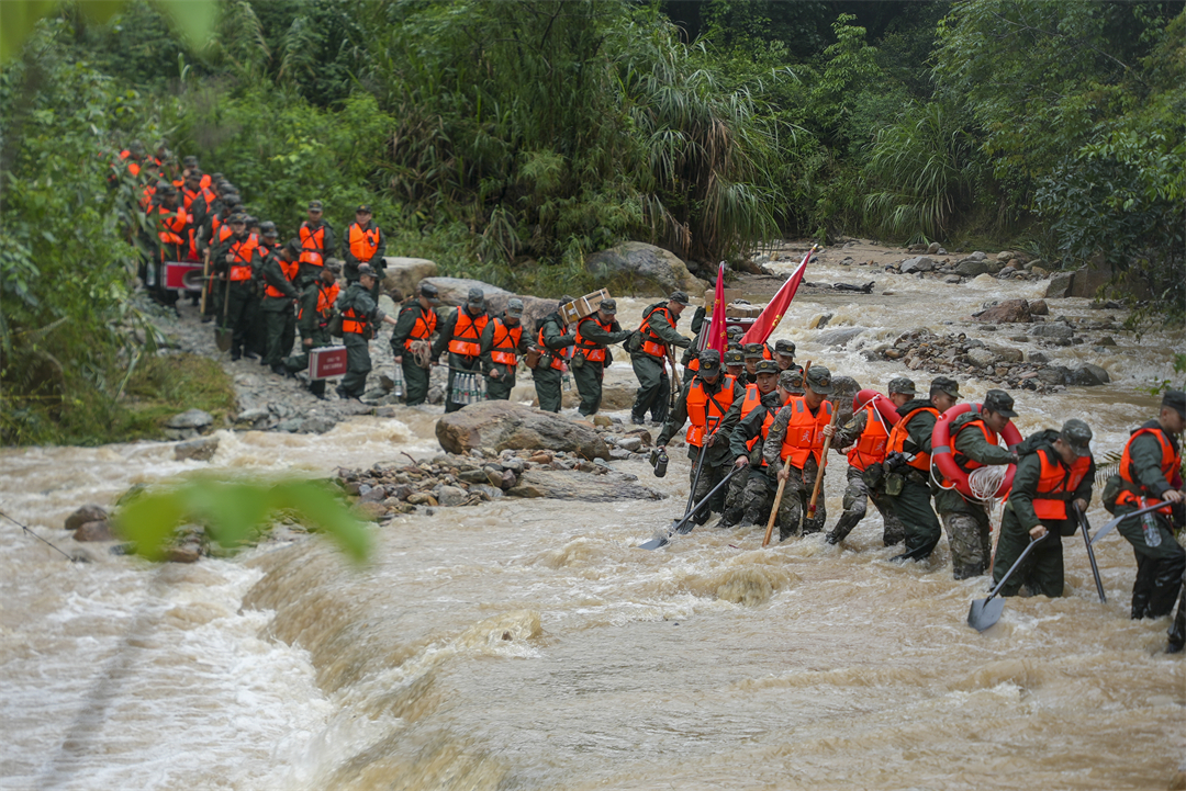 22日夜間,由于能見度不佳,道路搶通工作暫時(shí)停止,武警官兵采取接力的方式,將直升機(jī)、運(yùn)輸車等交通工具送達(dá)的物資進(jìn)行二次轉(zhuǎn)運(yùn),目前能保證受災(zāi)群眾基本的飲用水和食物需求。