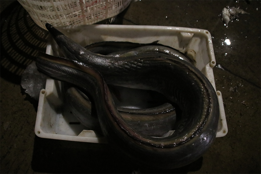 執(zhí)法員到達現(xiàn)場后,發(fā)現(xiàn)一處簡易碼頭處有數(shù)輛冷藏車聚集,一艘漁船正靠泊在碼頭旁,不僅關閉所有燈光,而且傳送帶及甲板上遺留有不少冰塊及海鮮。海警執(zhí)法員立即控制了現(xiàn)場5名司機及13名船員,并對冷藏車及漁船進行檢查。在冷藏車及漁船船艙內,執(zhí)法員發(fā)現(xiàn)大量未及時裝載的新鮮鰻魚、面包蟹、斑紋羊魚等漁獲物,該批漁獲物疑似非法捕撈所得。經清點,漁獲物超2.6萬公斤。目前,案件正在進一步調查中。