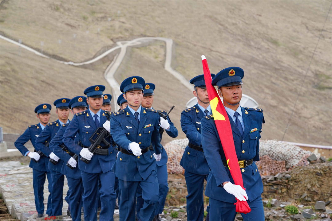 一路登高向上,氧氣逐漸稀薄,高原反應(yīng)不期而至,但大家參與的熱情卻格外高漲。湛藍(lán)的天空,屹立的雷達(dá)防風(fēng)罩,伴隨著雄壯的國(guó)歌聲,鮮艷的五星紅旗冉冉升起。在海拔5374米的陣地上,大家迎著勁風(fēng)肅然佇立,仰望國(guó)旗致敬,向著雪山和甘愿奉獻(xiàn)青春、守衛(wèi)祖國(guó)領(lǐng)空的戰(zhàn)士致敬!