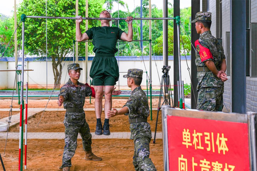 圖為參賽官兵正在進(jìn)行單杠引體向上競(jìng)賽。