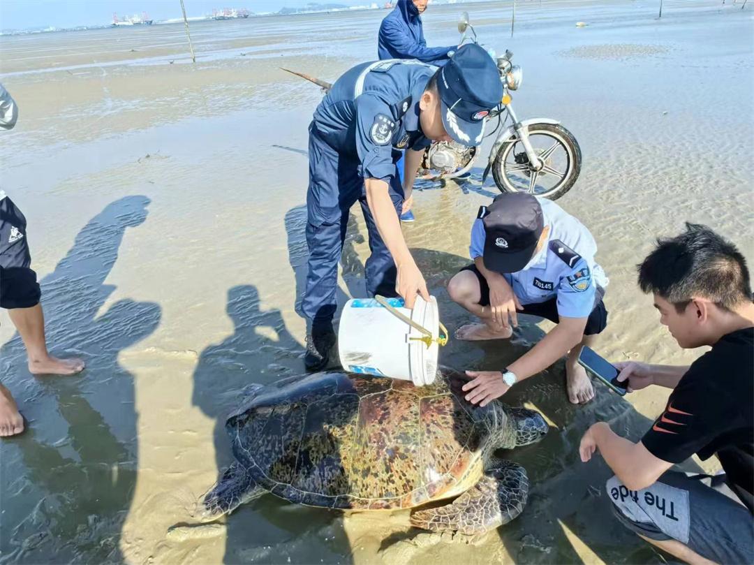 為避免綠海龜遭受二次傷害,執(zhí)法員一邊清理附近沙石雜物,一邊采用水桶澆水方式對其進(jìn)行保濕。觀察一段時(shí)間后,綠海龜生命體征和行動(dòng)能力開始逐漸恢復(fù),隨即被送至安全開闊海域放生。