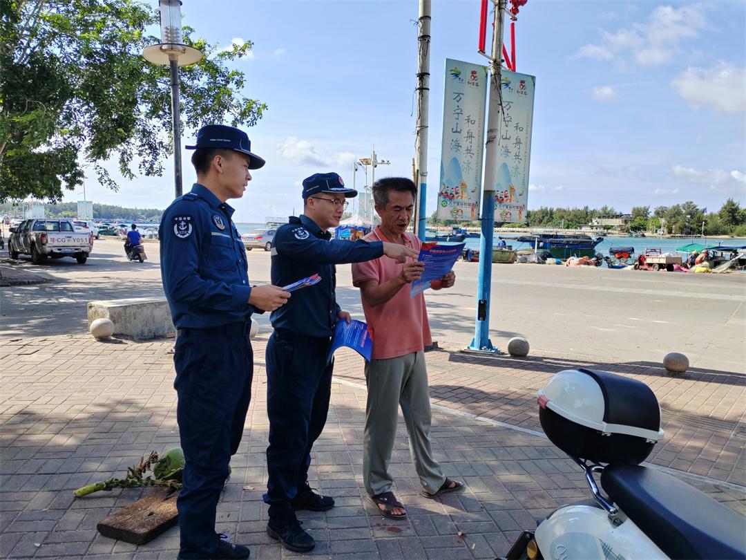 圖為8月14日,海南瓊海海警局在轄區(qū)碼頭進(jìn)行法治宣傳,執(zhí)法員向漁民群眾介紹相關(guān)法律法規(guī)、舉報(bào)途徑等。