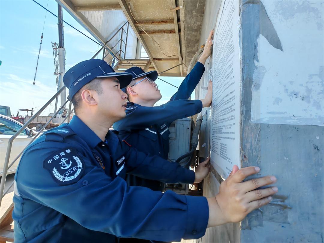 圖為6月27日,山東煙臺海警局長島工作站執(zhí)法員在轄區(qū)北長山島北城碼頭張貼執(zhí)法公告。盧煜萱 攝