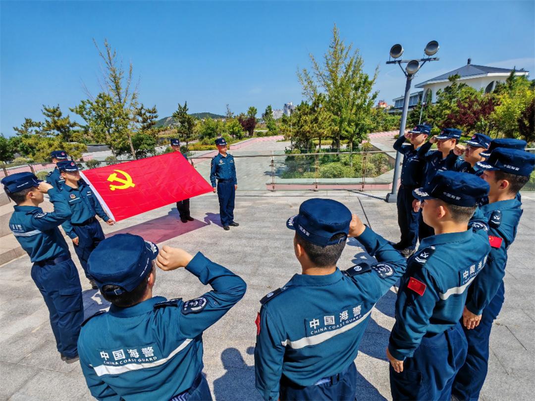 圖為7月1日,山東煙臺海警局長島工作站組織執(zhí)法員重溫入黨誓詞。盧煜萱 攝
