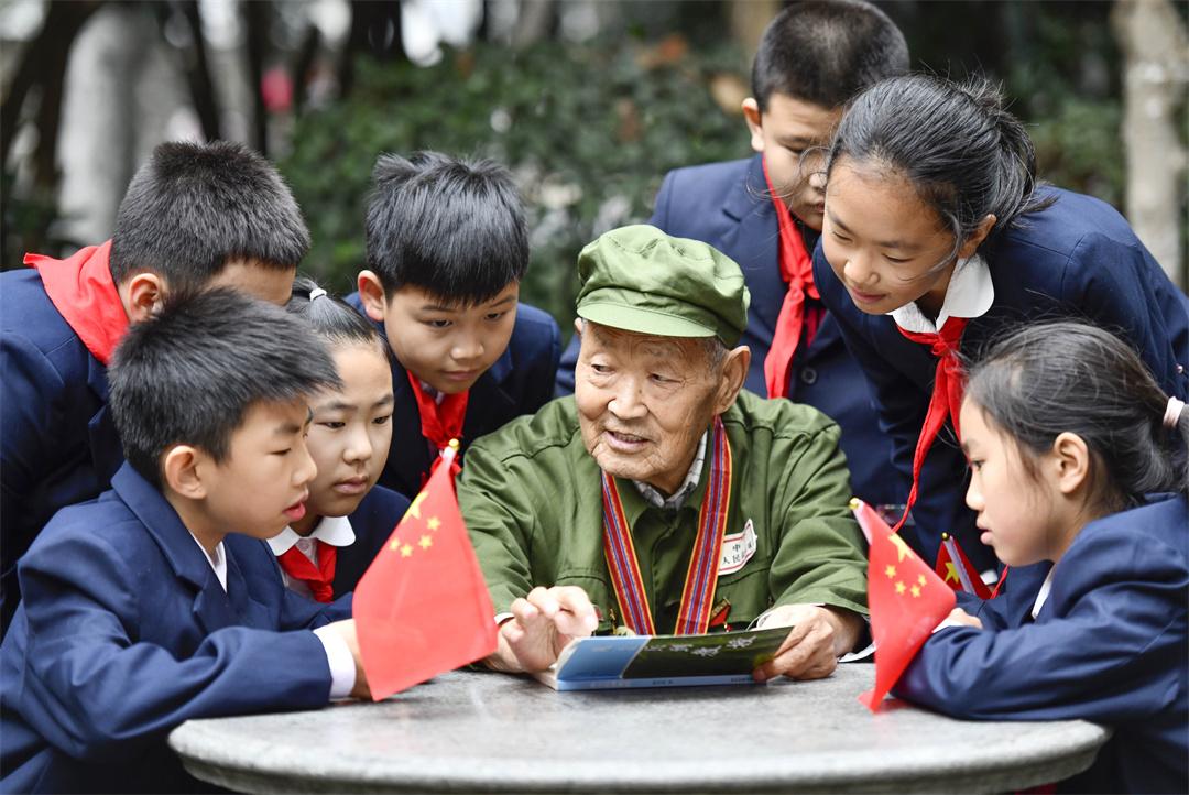 圖為89歲抗美援朝老兵楊克美給孩子們講述英雄故事。