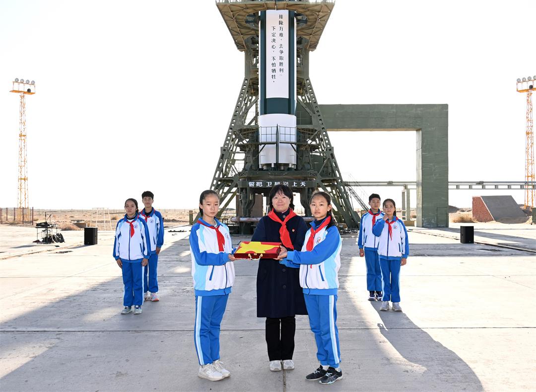 隨后,少先隊(duì)員們帶著國(guó)旗前往載人航天發(fā)射場(chǎng)。神舟十九號(hào)載人飛船發(fā)射任務(wù)0號(hào)指揮員趙磊為少先隊(duì)員們介紹了這座我國(guó)目前唯一的載人航天發(fā)射塔架。就在前幾天,神舟十九號(hào)航天員乘組從這里飛向中國(guó)空間站。截至目前,這里發(fā)射了19艘神舟飛船,將24名38人次航天員送入太空。這面滿載榮譽(yù)的國(guó)旗正是從這個(gè)塔架上隨航天員一同進(jìn)入中國(guó)空間站。