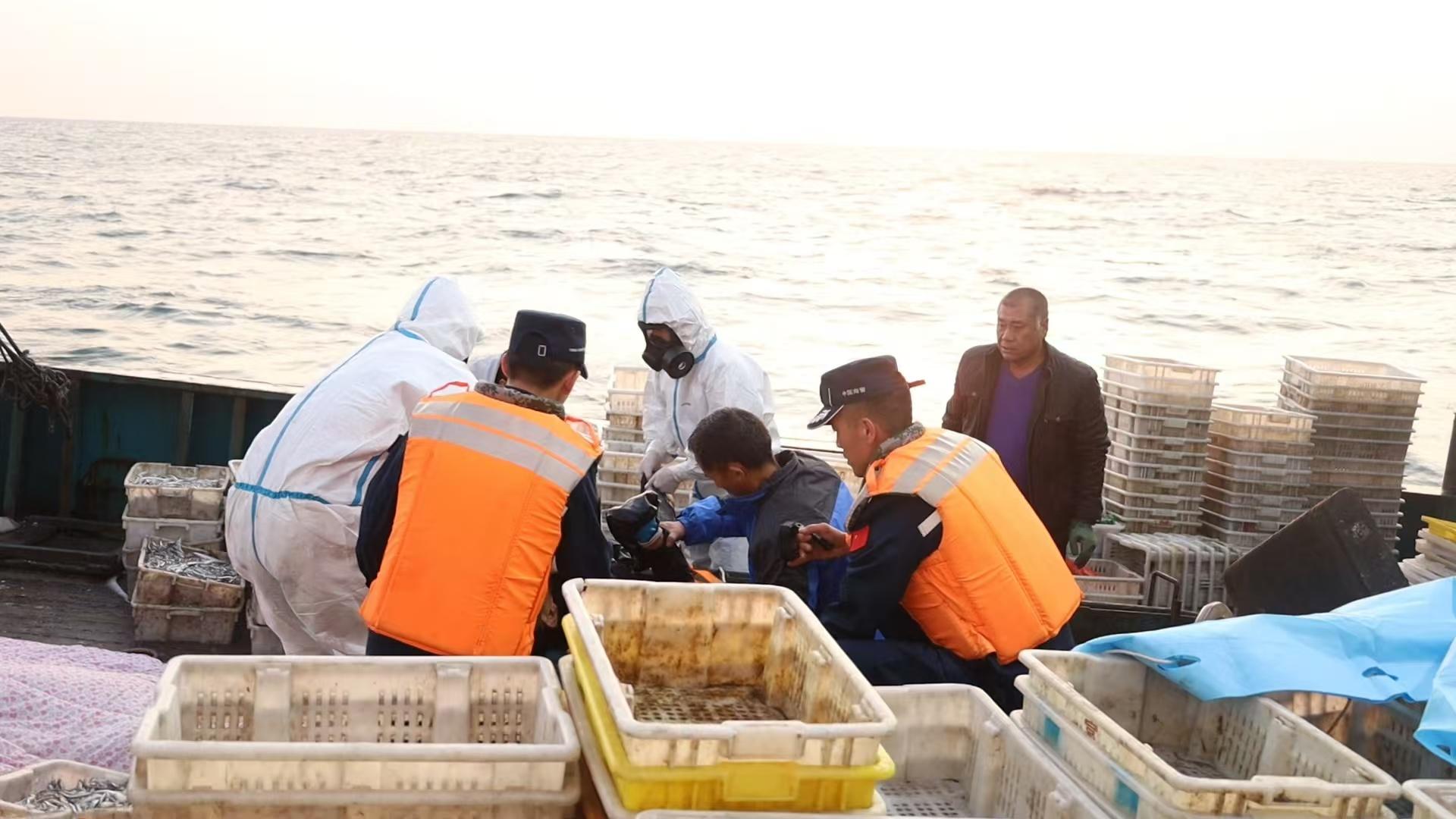 面對緊急情況,海警執(zhí)法員迅速行動,將漁艙內(nèi)船員轉(zhuǎn)移至漁船甲板上,并與醫(yī)務(wù)人員一同展開搶救。6名中毒船員和2名因救援吸入少許毒氣的船員順利過駁至白石艇,隨后白石艇向榮成第二工作站碼頭返航。