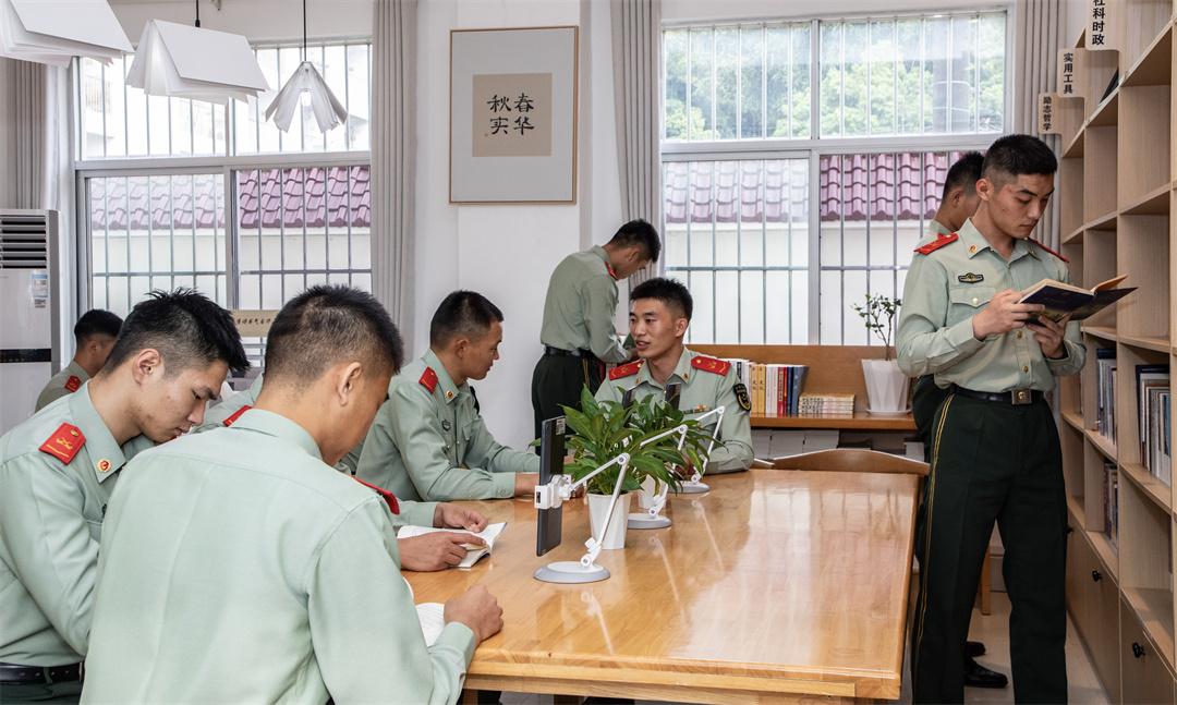 圖為武警官兵在強(qiáng)軍書(shū)屋靜心閱讀書(shū)刊。