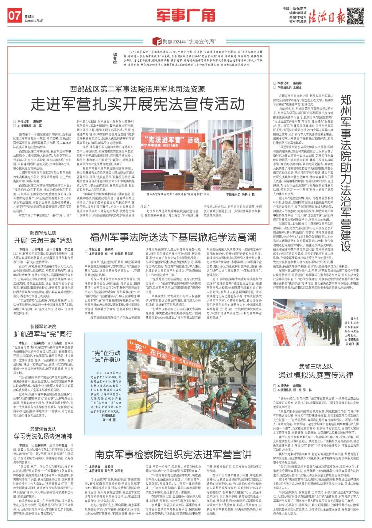 12月4日是第十一個國家憲法日,日前,中央宣傳部、司法部、全國普法辦聯(lián)合印發(fā)通知,以“大力弘揚憲法精神,推動進(jìn)一步全面深化改革”為主題,在全國組織開展2024年“憲法宣傳周”活動?;顒悠陂g,軍地法院、檢察院聯(lián)合部隊,通過宣講授課、贈送法律書籍、模擬庭審、現(xiàn)場提供法律咨詢等多種形式開展送法進(jìn)軍營活動,形成上下聯(lián)動、共同參與、整體推進(jìn)的憲法宣傳教育格局,不斷推動憲法宣傳教育取得實效,助力部隊法治軍營建設(shè)。