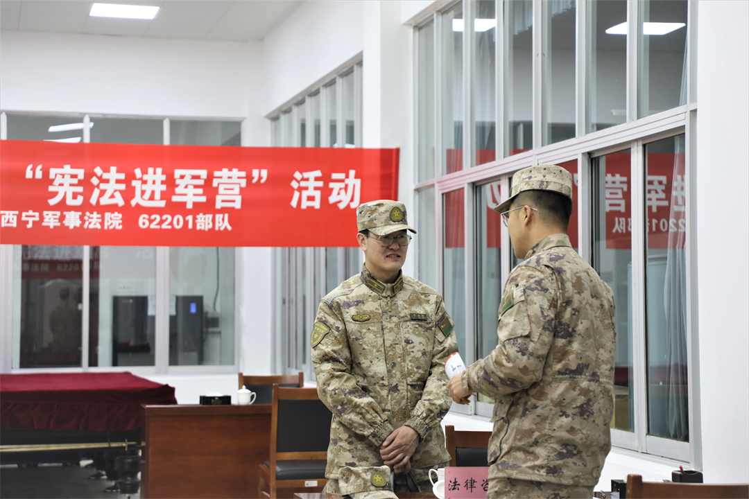 解放軍西寧軍事法院以“一生有‘憲’,‘法’護(hù)軍旅”為主題,組織送法小分隊深入案轄6個部隊單位,采取大課輔導(dǎo)、警示教育掛圖巡展、贈送普法書籍、組織主題簽名等形式,開展“憲法進(jìn)軍營”活動,將貫徹軍委主席負(fù)責(zé)制與維護(hù)憲法權(quán)威有機(jī)結(jié)合,以深入淺出的講解引導(dǎo)官兵學(xué)習(xí)憲法知識,樹牢看齊追隨意識。