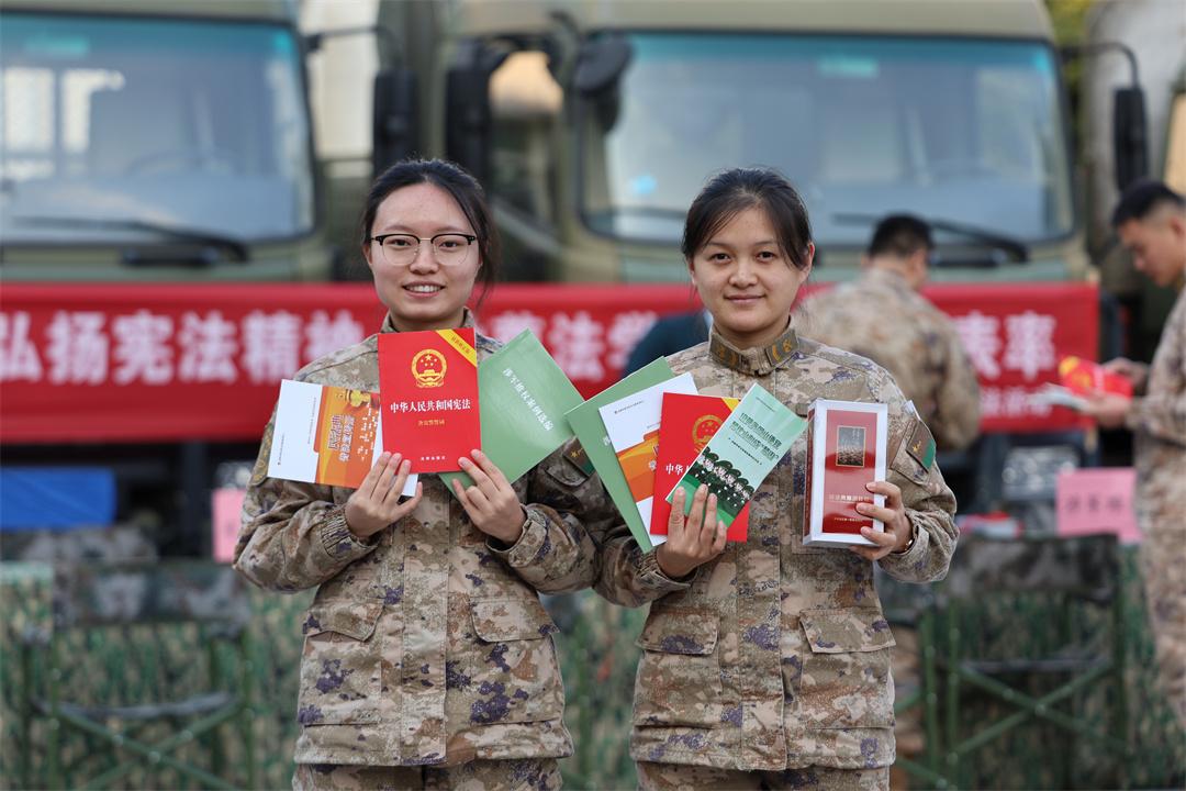 圖為兩名女兵展示獲贈(zèng)的普法資料。郭曉寧 攝