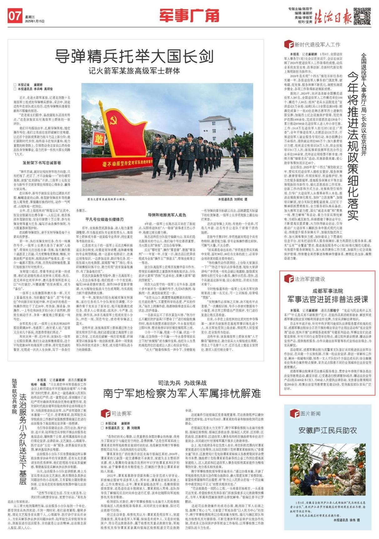 活動(dòng)期間,成都軍事法院與武警某支隊(duì)簽訂共同推進(jìn)依法治軍合作協(xié)議,在共建一個(gè)長(zhǎng)效機(jī)制、開展一輪法治宣講、聯(lián)創(chuàng)一家解紛工作室、解決一批疑難問題、培養(yǎng)一支人才隊(duì)伍5個(gè)方面達(dá)成共識(shí);結(jié)合案轄單位和承辦案件特點(diǎn)規(guī)律,首次試點(diǎn)探索不同行業(yè)領(lǐng)域單位法治宣傳教育模式。