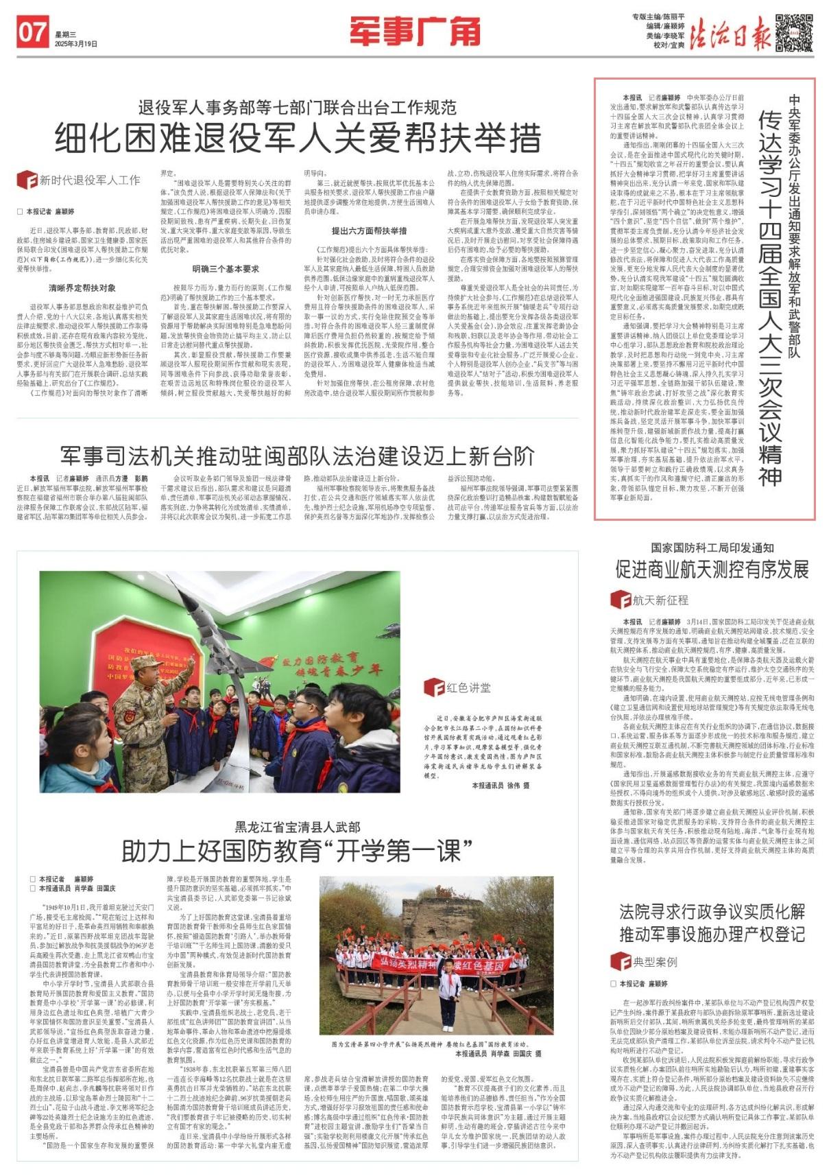 中央軍委辦公廳日前發(fā)出通知,要求解放軍和武警部隊(duì)認(rèn)真?zhèn)鬟_(dá)學(xué)習(xí)十四屆全國人大三次會議精神,認(rèn)真學(xué)習(xí)貫徹習(xí)主席在解放軍和武警部隊(duì)代表團(tuán)全體會議上的重要講話精神。