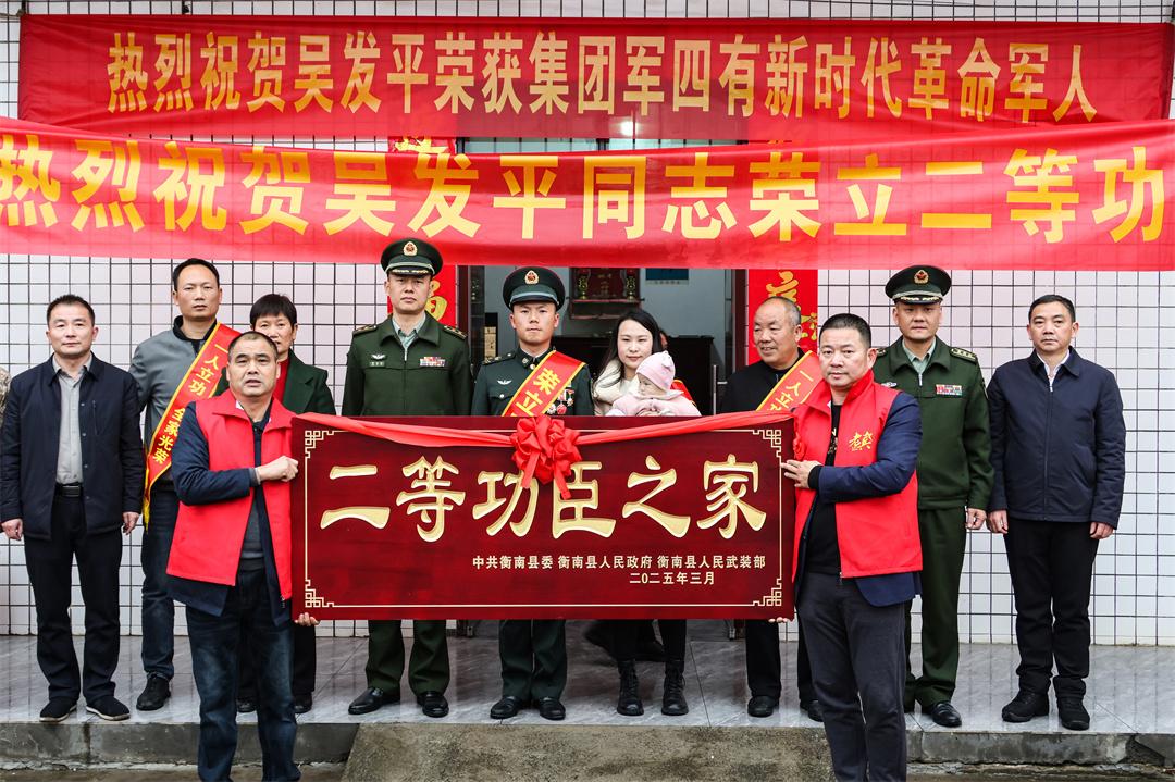 圖為軍地領(lǐng)導(dǎo)為榮立二等功的現(xiàn)役軍人吳發(fā)平頒授匾牌。