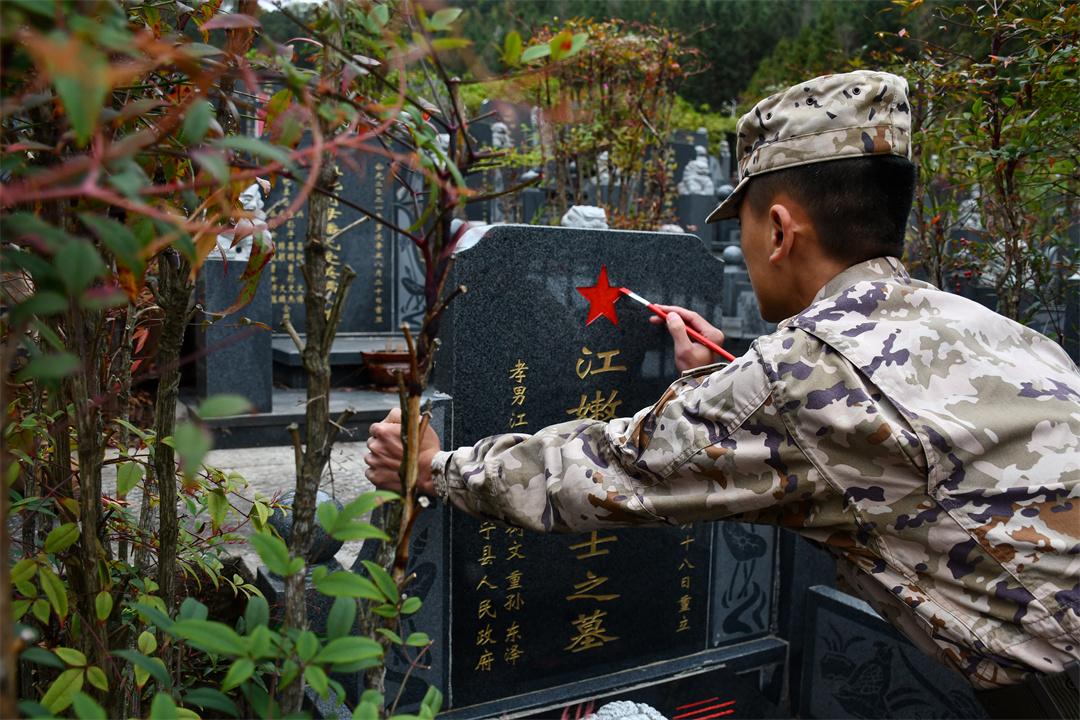 活動現(xiàn)場,大家一致表示:“為烈士墓碑描紅,既是對烈士紀念設(shè)施的修繕,更是賡續(xù)紅色血脈的精神傳承?!惫ぷ魅藛T同步核對烈士信息,向參加活動人員講述鐫刻在墓碑背后的英雄事跡。檢察干警和消防救援指戰(zhàn)員為每座墓冢培土除草,用白菊替換褪色的絹花。最后,武警官兵全體列隊行軍禮告慰英靈。