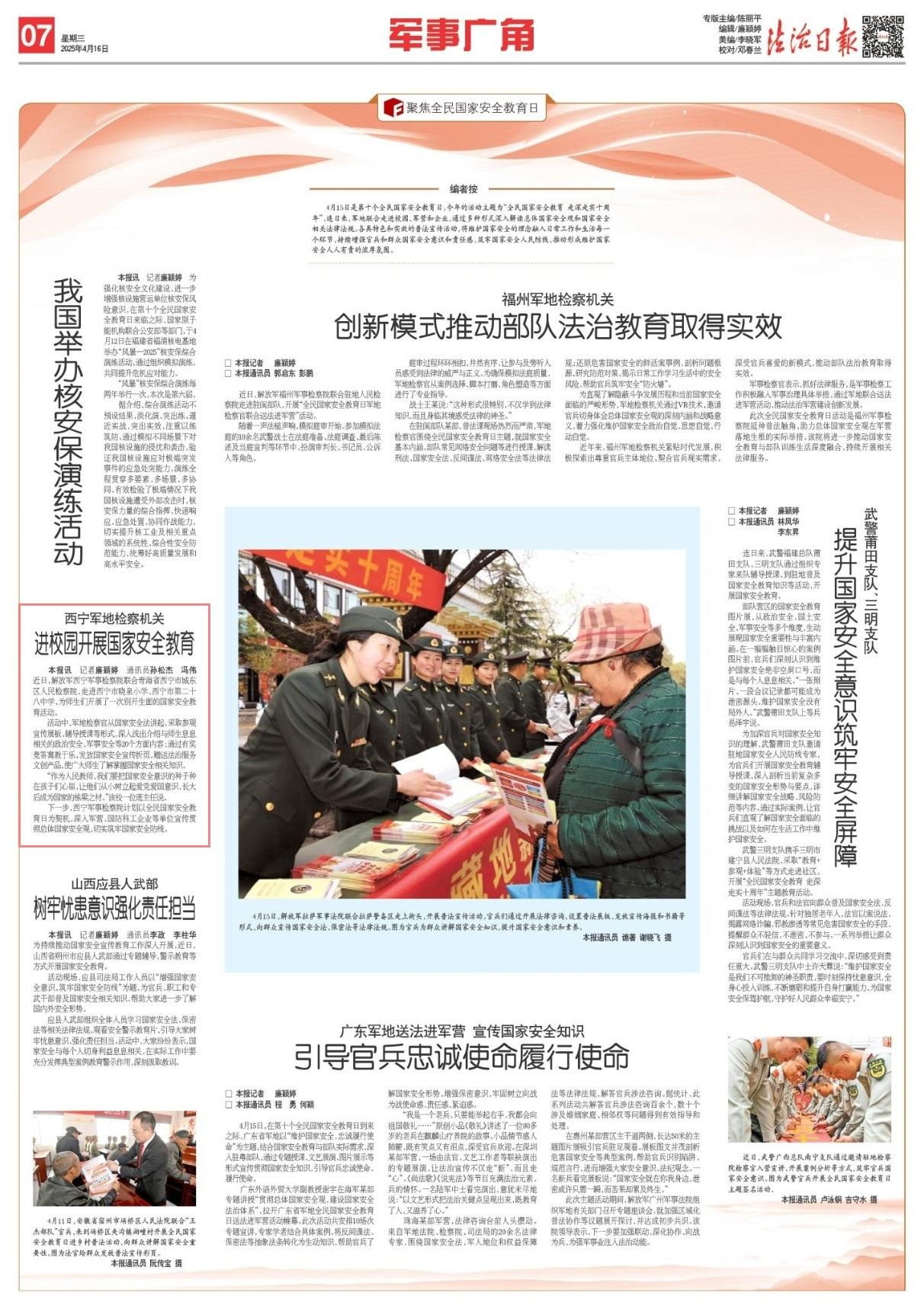 下一步,西寧軍事檢察院計劃以全民國家安全教育日為契機,深入軍營、國防科工企業(yè)等單位宣傳貫徹總體國家安全觀,切實筑牢國家安全防線。