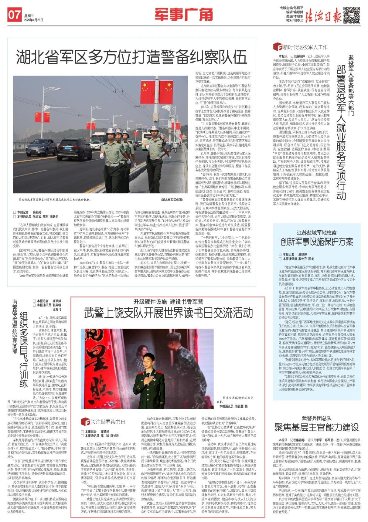 4月23日是第30個世界讀書日,連日來,武警江西總隊(duì)上饒支隊(duì)所屬各中隊(duì)通過不同形式,開展群眾性讀書交流活動。