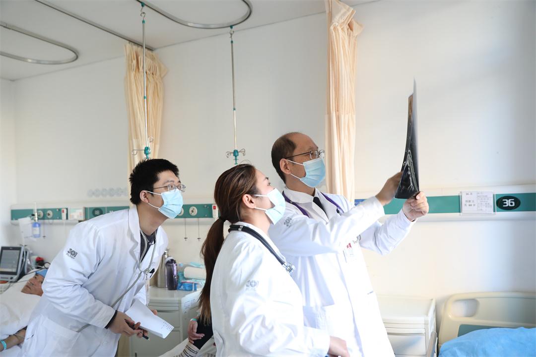 圖為胸外科主任宋偉安帶領(lǐng)團隊研究胸部CT和病情資料。
