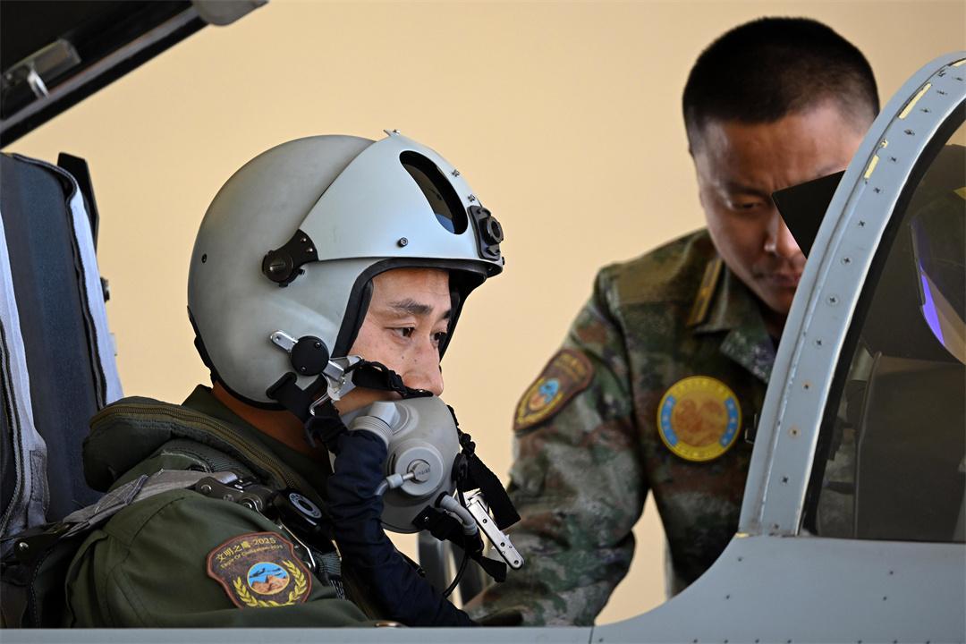 圖為4月19日,埃及空軍某基地,參加中?!拔拿髦?2025”空軍聯(lián)合訓(xùn)練的中國(guó)空軍飛行員進(jìn)行起飛前檢查。余紅春 攝