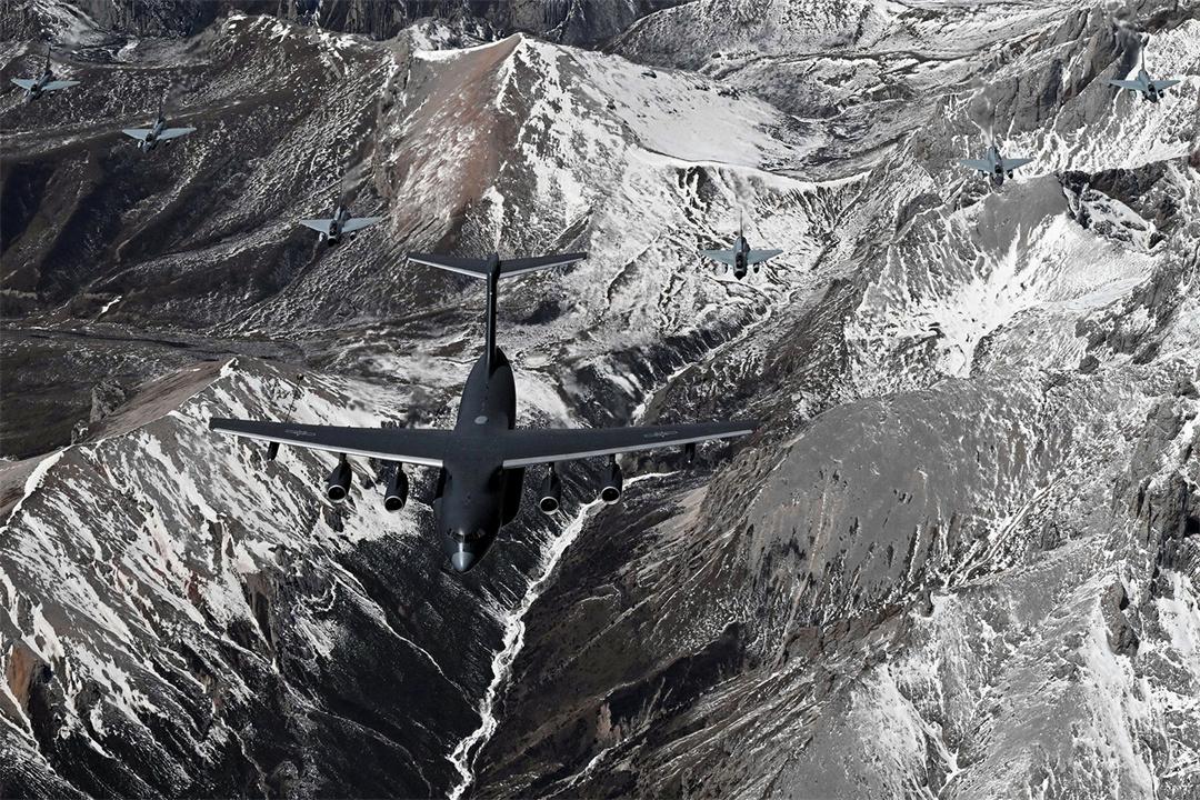 圖為4月12日,中國(guó)境內(nèi),參加中?!拔拿髦?2025”空軍聯(lián)合訓(xùn)練的運(yùn)油-20和殲-10戰(zhàn)機(jī)編隊(duì)飛躍雪山。余紅春 攝
