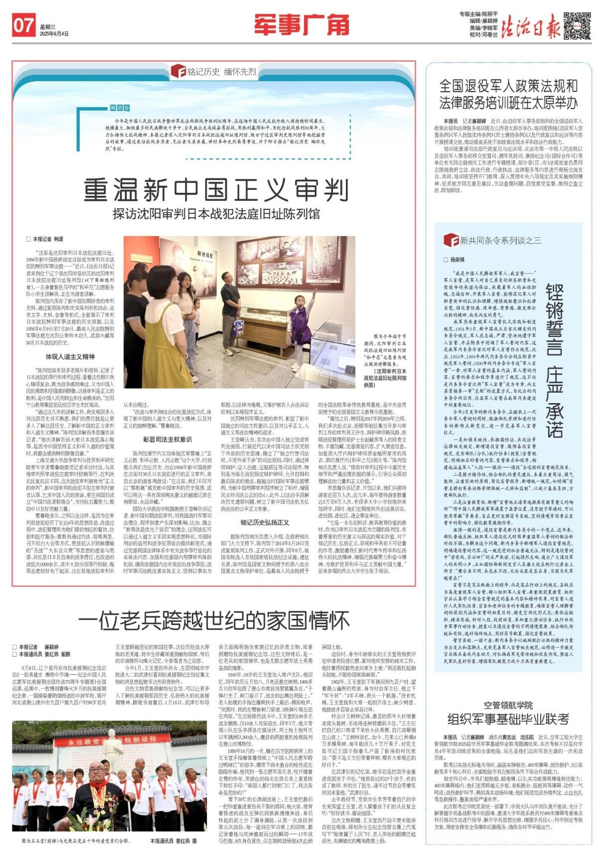 今年是中國人民抗日戰(zhàn)爭暨世界反法西斯戰(zhàn)爭勝利80周年。在這場中國人民反抗外敵入侵持續(xù)時間最長、規(guī)模最大、犧牲最多的民族解放斗爭中,全民族眾志成城奮勇抗戰(zhàn),用勝利贏得和平。為紀念抗戰(zhàn)勝利80周年,大力弘揚偉大抗戰(zhàn)精神,本報記者深入沈陽審判日本戰(zhàn)犯法庭舊址陳列館、陜甘寧邊區(qū)審判史陳列館等地挖掘背后的故事,通過采訪抗戰(zhàn)親歷者、見證者及其親屬,講好革命先烈英勇事跡,并于即日推出“銘記歷史 緬懷先烈”專欄。
