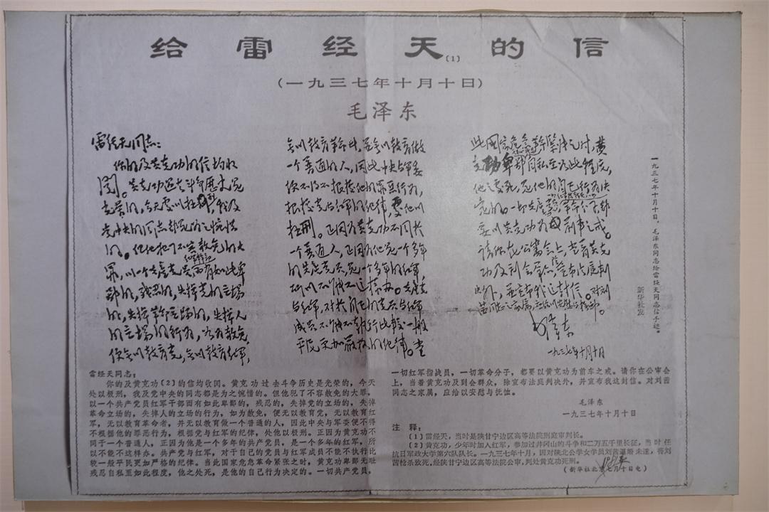 圖為陳列館展出的毛澤東給審判長雷經(jīng)天的信。韓瀟 攝