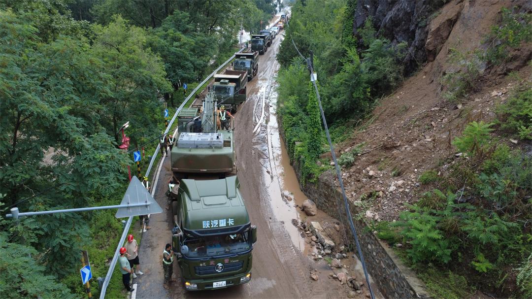 山洪造成多處道路中斷,人員車輛無(wú)法通行,武警官兵采取人歇機(jī)不歇的方式連夜搶通道路。