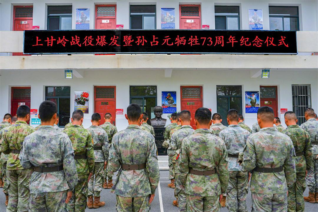 紀念儀式開始,連隊官兵仔細整理花籃綢帶,并脫帽默哀,深切緬懷孫占元老排長。花籃上“紀念上甘嶺戰(zhàn)役爆發(fā)73周年”“紀念一級英雄孫占元犧牲73周年”的綢帶隨風飄揚。
