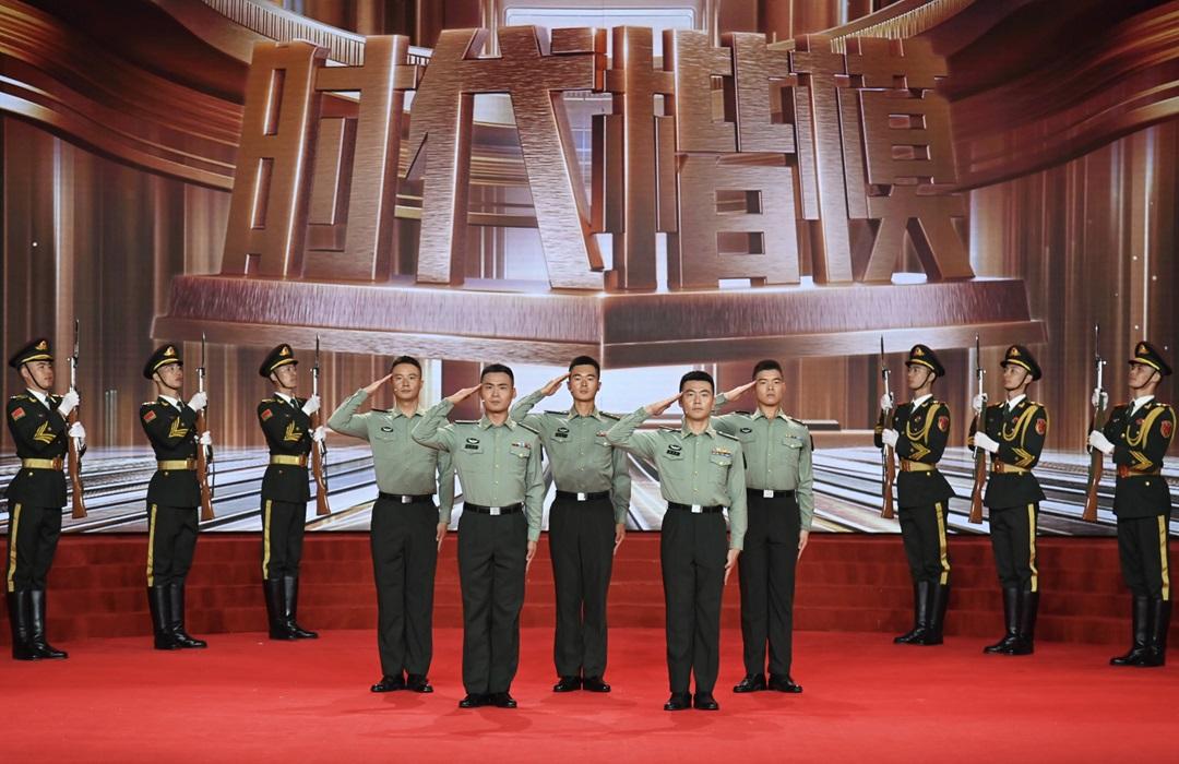 圖為在“時(shí)代楷模”發(fā)布儀式上,陸軍第八十二集團(tuán)軍某旅“劉老莊連”官兵代表敬禮。張永進(jìn) 攝