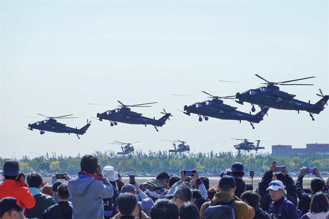 在開幕式飛行表演環(huán)節(jié),陸軍“風(fēng)雷”飛行表演隊(duì)以七機(jī)通場(chǎng)飛行拉開帷幕,先后向觀眾演示了雙機(jī)對(duì)沖、四機(jī)開花,以及快速營救、繞點(diǎn)回轉(zhuǎn)等實(shí)戰(zhàn)應(yīng)用演示,為觀眾呈現(xiàn)了一場(chǎng)融合技術(shù)、藝術(shù)與力量的空中盛宴,全面展示了國產(chǎn)直升機(jī)的卓越性能和飛行員的精湛技術(shù)。同時(shí),也充分展示了陸軍航空兵部隊(duì)轉(zhuǎn)型建設(shè)和實(shí)戰(zhàn)化訓(xùn)練成效。