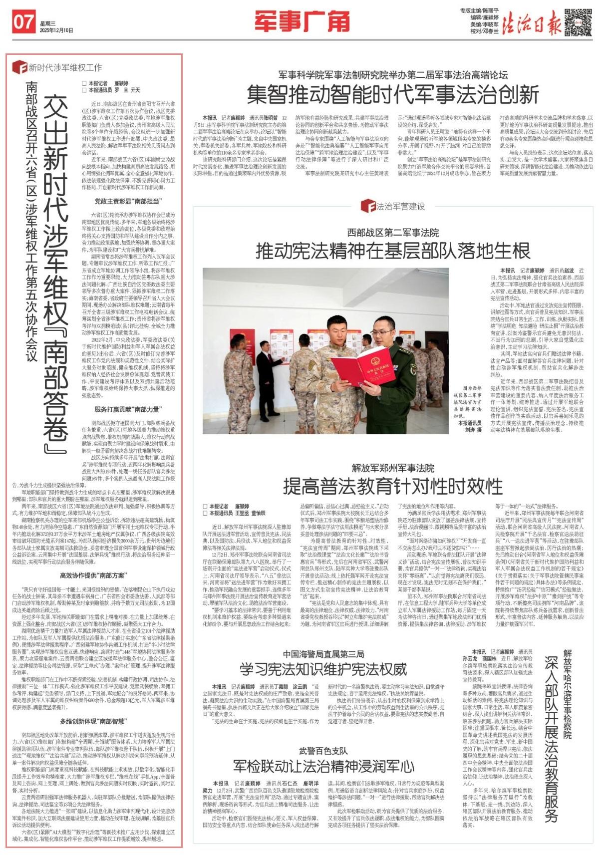 近年來,南部戰(zhàn)區(qū)六?。▍^(qū))牢固樹立為戰(zhàn)向戰(zhàn)根本指向,加快構(gòu)建高質(zhì)高效發(fā)展路徑,用心用情強(qiáng)化擁軍優(yōu)屬,全心全意強(qiáng)化軍地協(xié)作,依法依規(guī)強(qiáng)化政法保障,不斷完善同心同力工作格局,開創(chuàng)新時代涉軍維權(quán)工作新局面。
