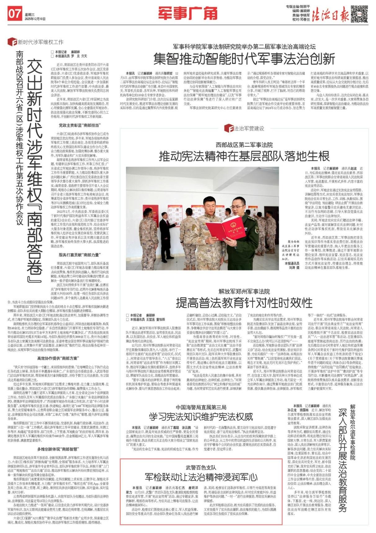12月2日,武警廣西總隊百色支隊邀請駐地檢察院檢察官走進軍營,開展“憲法宣傳周”活動,通過專題宣講、案例解析、現(xiàn)場咨詢等形式,為官兵送上精準司法服務,讓法治精神浸潤軍心。