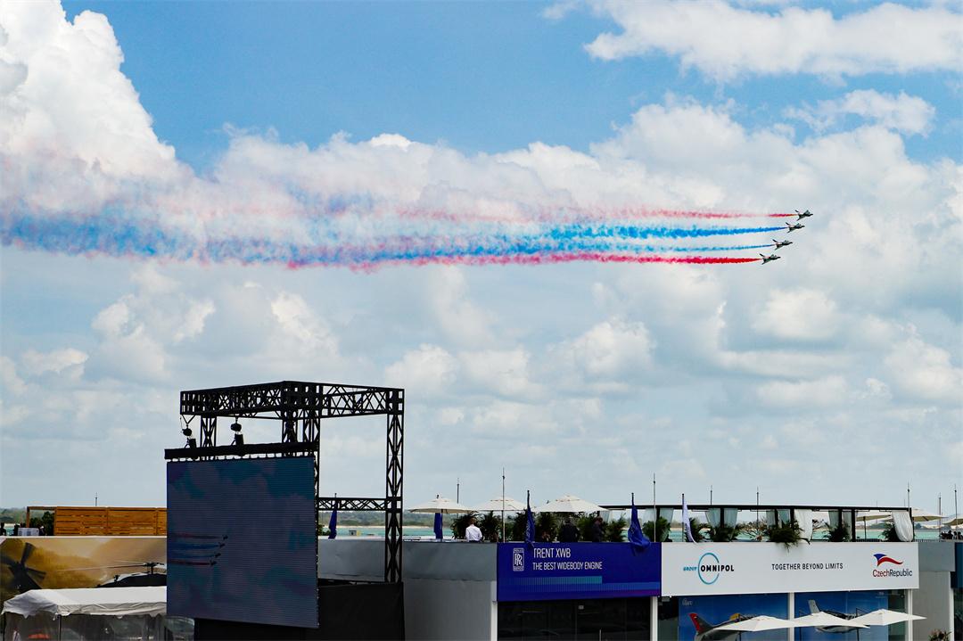 13時許,噴涂中國國旗和八一軍徽的表演機抵達樟宜展覽中心海面上空,率先編成超密集六機大箭隊,在空中拉出紅、黃、藍3種顏色6道彩煙,以低空通場形式展現(xiàn)特殊禮儀,用“彩虹”向各國來賓致以最真摯的問候。