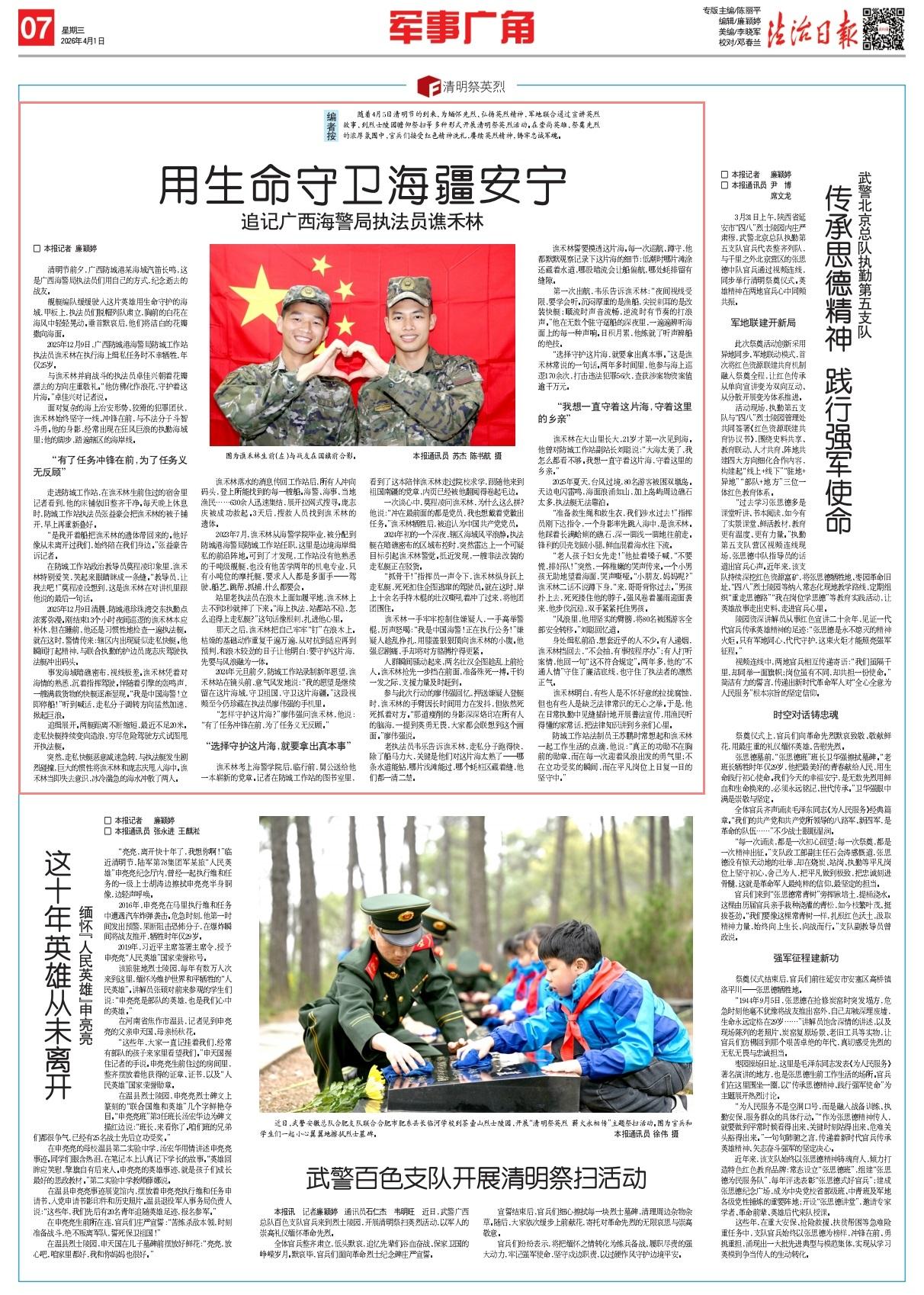 隨著4月5日清明節(jié)的到來,為緬懷先烈、弘揚(yáng)英烈精神,軍地聯(lián)合通過宣講英烈故事、到烈士陵園瞻仰祭掃等多種形式開展清明祭英烈活動(dòng)。在崇尚英雄、祭奠先烈的濃厚氛圍中,官兵們接受紅色精神洗禮,賡續(xù)英烈精神,鑄牢忠誠(chéng)軍魂。