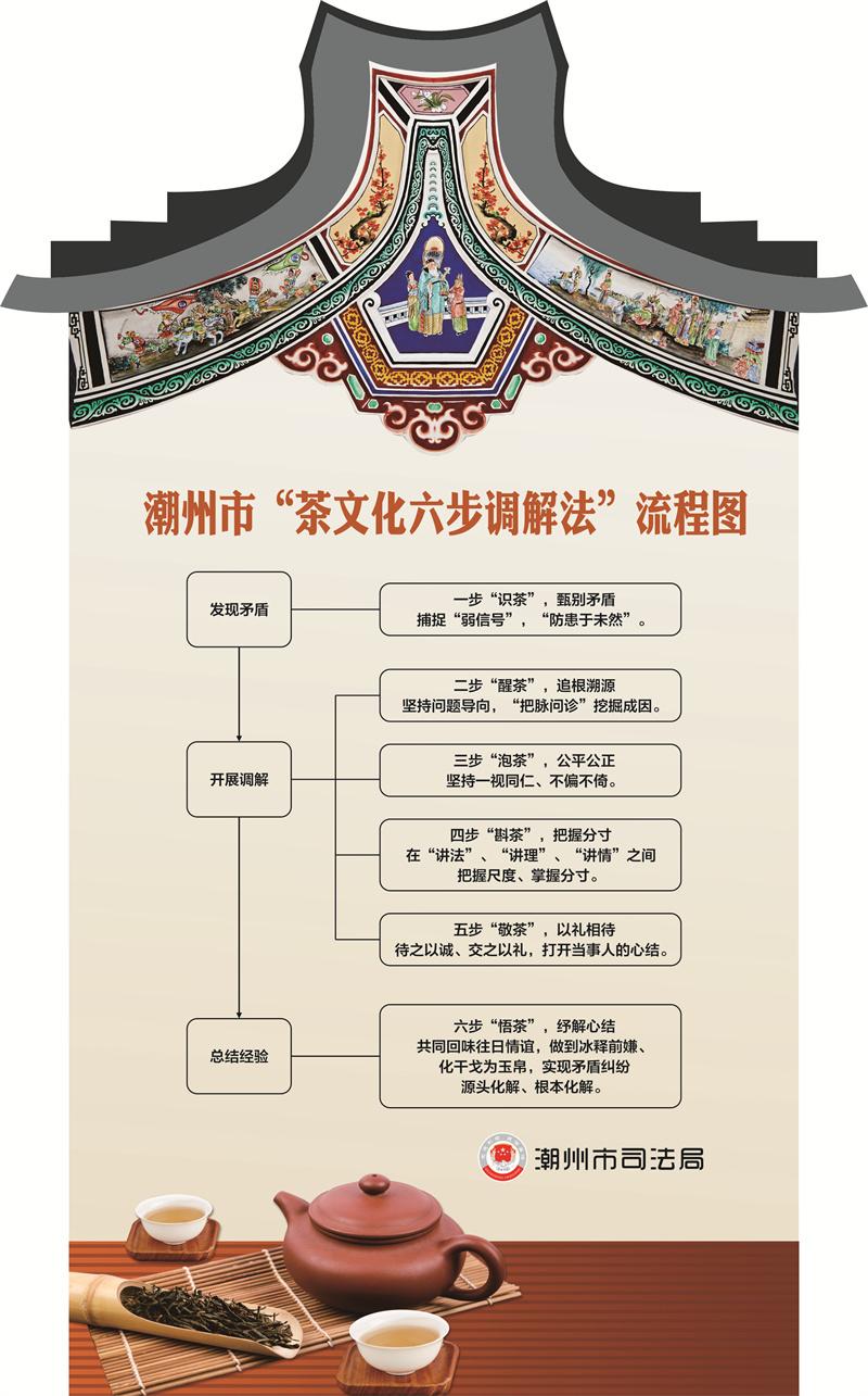 品一杯清茶,解雙方心結(jié)。據(jù)悉,近年來(lái),潮州市堅(jiān)持發(fā)展新時(shí)代廣東“楓橋經(jīng)驗(yàn)”,以潮州工夫茶“和、敬、精、樂”的文化精髓為基礎(chǔ),將“工夫茶二十一式”泡茶步驟與調(diào)解相結(jié)合,創(chuàng)設(shè)特色鮮明的“茶文化六步調(diào)解法”,打造了具有潮州特色的文化調(diào)解品牌。