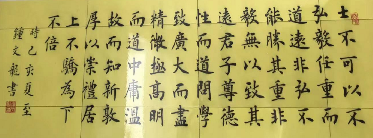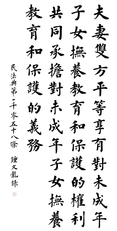 2020年7月11日,司法部普法與依法治理局和法制日?qǐng)?bào)社共同主辦了“書(shū)·法”系列活動(dòng)。鐘文龍先生應(yīng)邀書(shū)寫(xiě)民法典第一千零五十八條: “夫妻雙方平等享有對(duì)未成年子女撫養(yǎng)、教育和保護(hù)的權(quán)利,共同承擔(dān)對(duì)未成年子女撫養(yǎng)、教育和保護(hù)的義務(wù)。”因其作品周正雅致而頗受好評(píng)。
