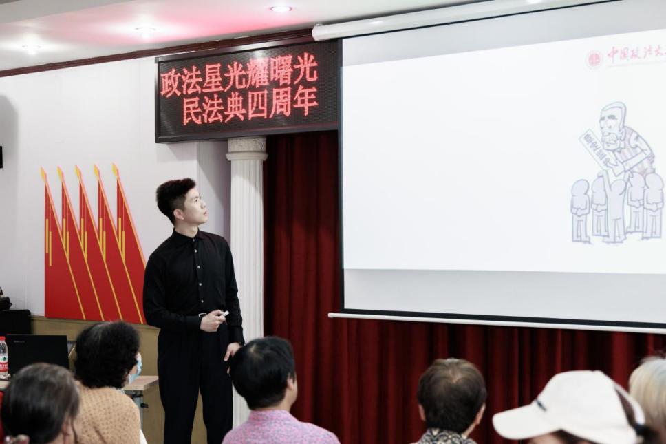 法大民商經(jīng)濟(jì)法學(xué)院民商法學(xué)專業(yè)碩士研究生顏鄭濤同學(xué)以“民法典中的老年人權(quán)益保護(hù)”為主題,為社區(qū)居民代表講述了民法典中與老年人切身利益密切相關(guān)的內(nèi)容。