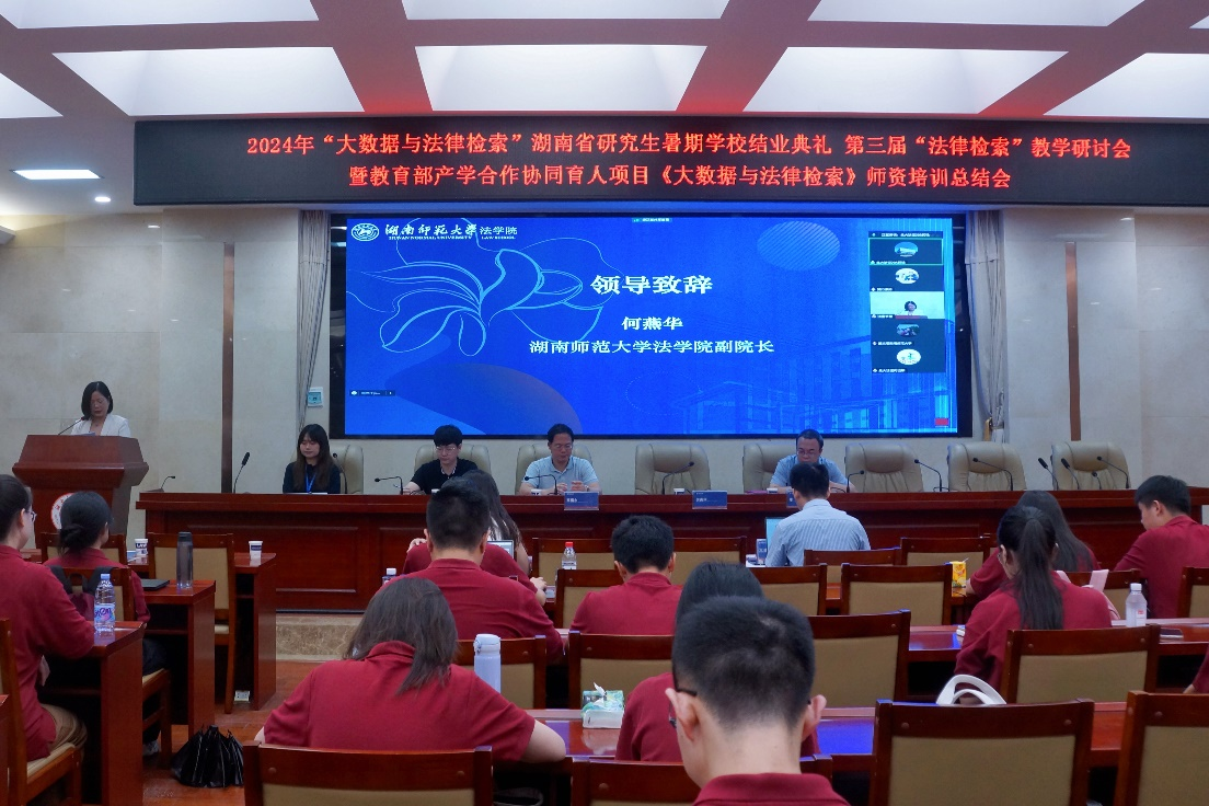 7月28日上午,2024“大數(shù)據(jù)與法律檢索”湖南省研究生暑期學(xué)校結(jié)業(yè)典禮、第三屆“法律檢索”教學(xué)研討會暨教育部產(chǎn)學(xué)合作協(xié)同育人項(xiàng)目《大數(shù)據(jù)與法律檢索》師資培訓(xùn)總結(jié)會在湖南師范大學(xué)法學(xué)院舉行,湖南師范大學(xué)法學(xué)院副院長何燕華、湖南師范大學(xué)法學(xué)院副院長歐福永、湖南師范大學(xué)法學(xué)院副教授黃文旭、本次暑期學(xué)校班主任李部(北大法寶學(xué)堂)、湖南師范大學(xué)法學(xué)院法碩辦輔導(dǎo)員羅昊、大連財經(jīng)學(xué)院教師王杰彥、武漢東湖學(xué)院教師王建東、大連海事大學(xué)法學(xué)院教師吳淞豫及線上嘉賓廣東外語外貿(mào)大學(xué)教授曾赟、北大法寶副總經(jīng)理何遠(yuǎn)瓊博士出席本次結(jié)業(yè)典禮。湖南師范大學(xué)法學(xué)院研究生工作辦公室主任王丹主持本次結(jié)業(yè)典禮。