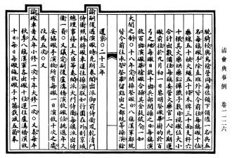 “事例”原指先前存在的成例。在中國古代,事例對后發(fā)類案之處置,多具指導(dǎo)意義。西晉時,楊駿以謀反之罪見誅,其弟楊珧雖陳情自告仍受牽連。“當(dāng)時皆謂宜為申理,合依鐘繇事例”,時人援引鐘繇免于鐘會之誅事,欲援救楊珧。逮至明代,“事例”已表現(xiàn)出與會典的密切聯(lián)系?!度f歷會典》載,“其近年六部等衙門見行事例,各令選委司屬官,遵照體例,分類編集”。洎乎清代,“會典事例”作為一種法律形式繼續(xù)發(fā)展?!犊滴鯐洹仿氏壤宥ā笆吕钡念愋汀Gr,認(rèn)為“夫例可通,典不可變”,典與例當(dāng)分離。遂在制定《大清會典》之余,另編《大清會典則例》180卷。嘉慶朝在編纂《大清會典》之外,又有《大清會典事例》920卷、《欽定大清會典圖》132卷。至此,“會典事例”以一種法律形式獨立于“會典”存在。
