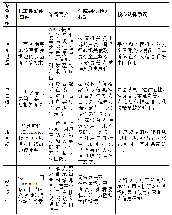 本文立足于司法實(shí)踐的視角,對(duì)大規(guī)模個(gè)人信息處理在我國(guó)引發(fā)的系統(tǒng)性法律風(fēng)險(xiǎn)及其治理路徑進(jìn)行了系統(tǒng)性考察。研究表明,隨著數(shù)字經(jīng)濟(jì)的深化,相關(guān)風(fēng)險(xiǎn)已超越了傳統(tǒng)的個(gè)人隱私侵權(quán)范疇,演化為關(guān)乎數(shù)據(jù)安全與可用性、權(quán)利行使與平臺(tái)責(zé)任平衡,以及對(duì)既有法律概念體系沖擊的三個(gè)核心維度。通過(guò)對(duì)檢察公益訴訟、算法歧視、服務(wù)終止和數(shù)字遺產(chǎn)四類典型案例的深度剖析。
