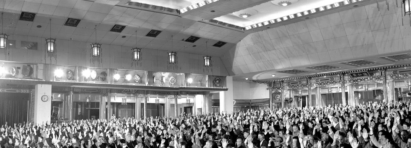 出席第一次全國人民代表大會的代表舉手通過周恩來作的《政府工作報(bào)告》(資料照片)。