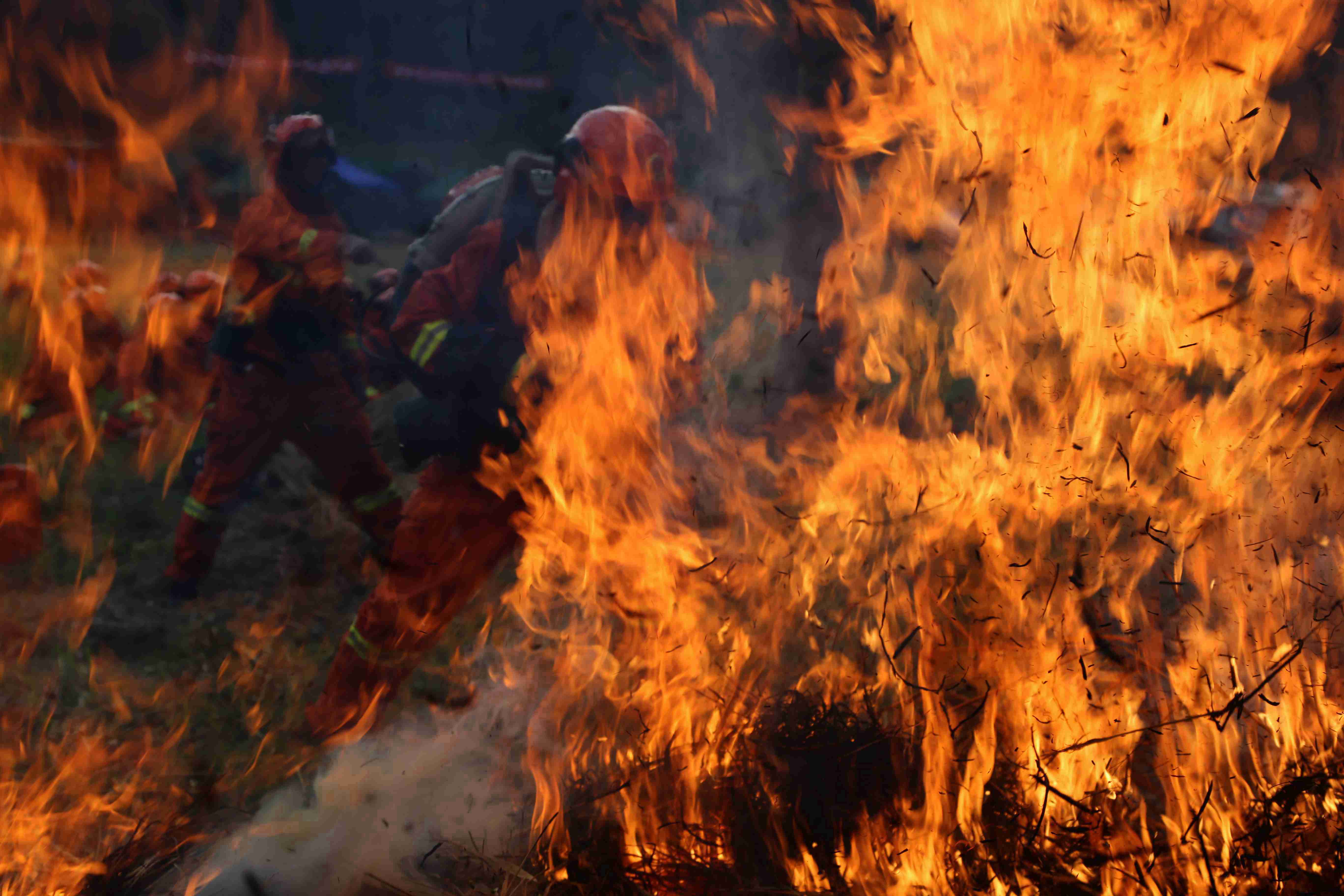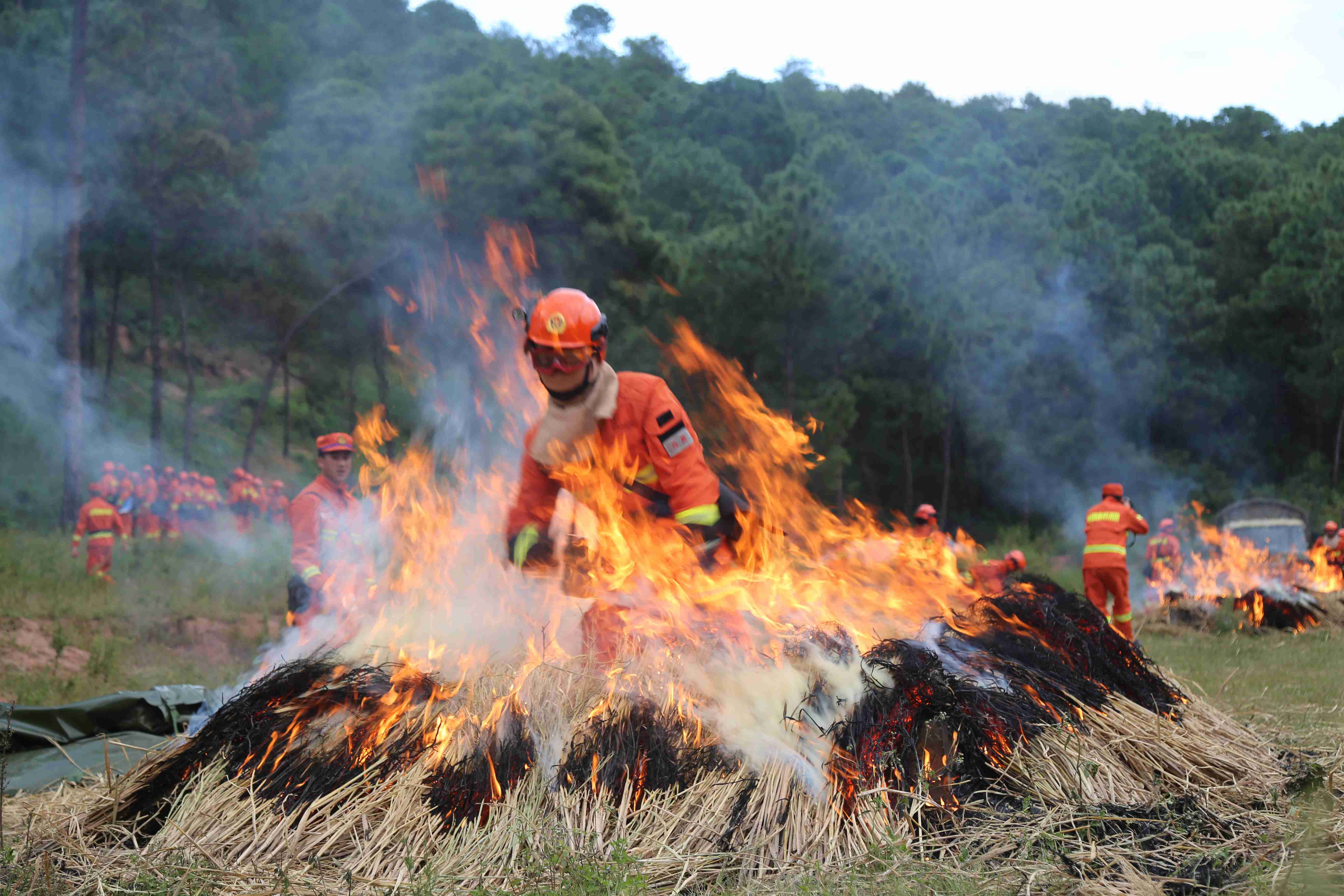 火燒了起來,加斯伍各看到中隊長“開始”的手勢,帶頭沖了上去,與灼熱的氣浪剛打了個照面,他本能地后退了幾步,但一想到老隊員都在身后看著,這個要強的彝族小伙不服輸?shù)哪枪蓜乓幌戮蜕蟻砹?,揮舞著手中的風機與火魔斗了起來。