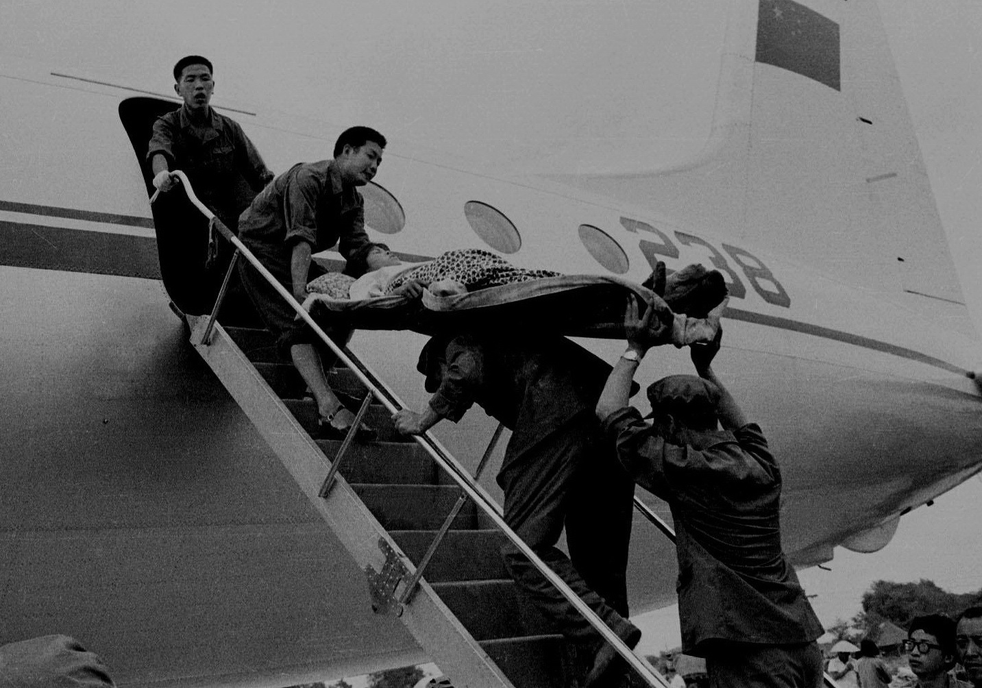 1976年唐山大地震。唐山機(jī)場,子弟兵護(hù)送重傷員。蔣鐸攝