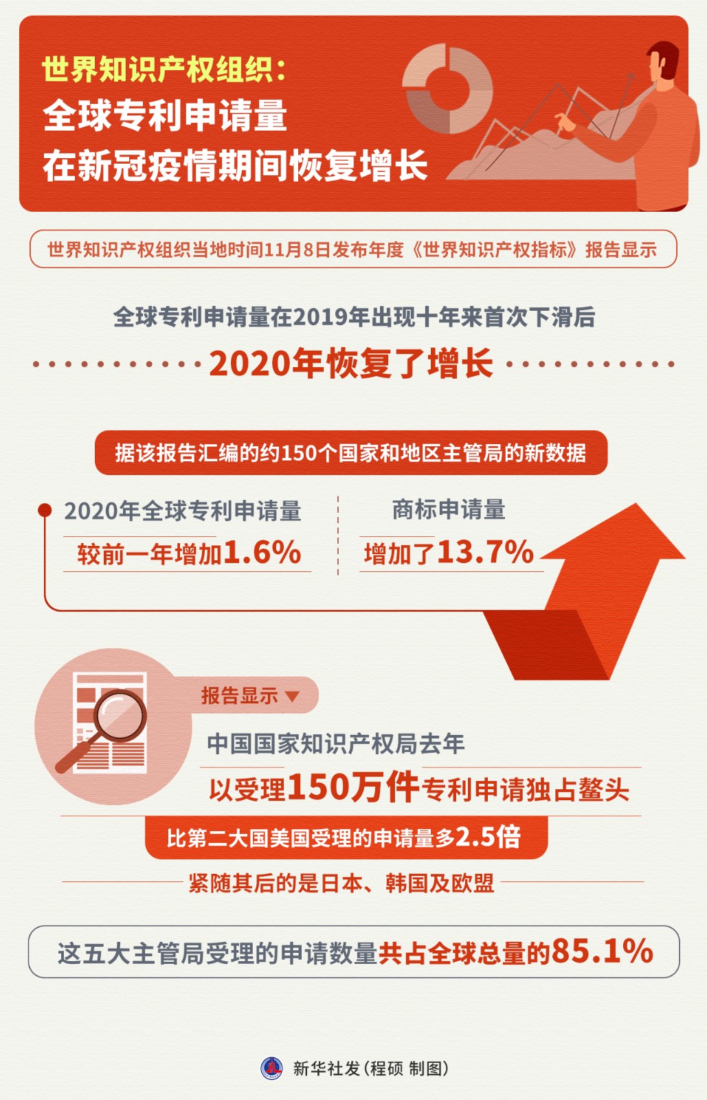 世界知識(shí)產(chǎn)權(quán)組織11月8日發(fā)布年度《世界知識(shí)產(chǎn)權(quán)指標(biāo)》報(bào)告顯示,全球?qū)@暾?qǐng)量在2019年出現(xiàn)十年來(lái)首次下滑后,2020年恢復(fù)了增長(zhǎng)。