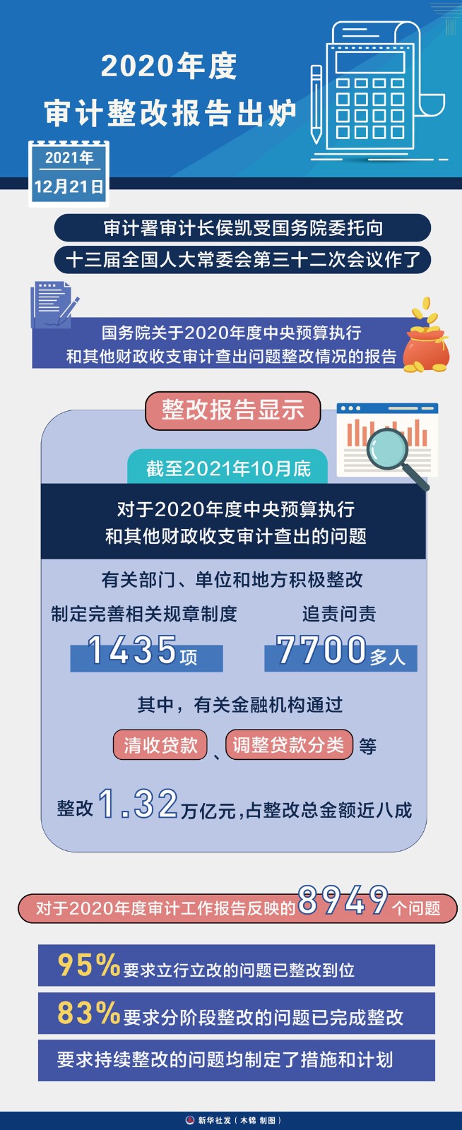 截至2021年10月底,對(duì)于2020年度中央預(yù)算執(zhí)行和其他財(cái)政收支審計(jì)查出的問(wèn)題,有關(guān)部門(mén)、單位和地方積極整改,制定完善相關(guān)規(guī)章制度1435項(xiàng),追責(zé)問(wèn)責(zé)7700多人,其中,有關(guān)金融機(jī)構(gòu)通過(guò)清收貸款、調(diào)整貸款分類(lèi)等整改1.32萬(wàn)億元,占整改總金額近八成。