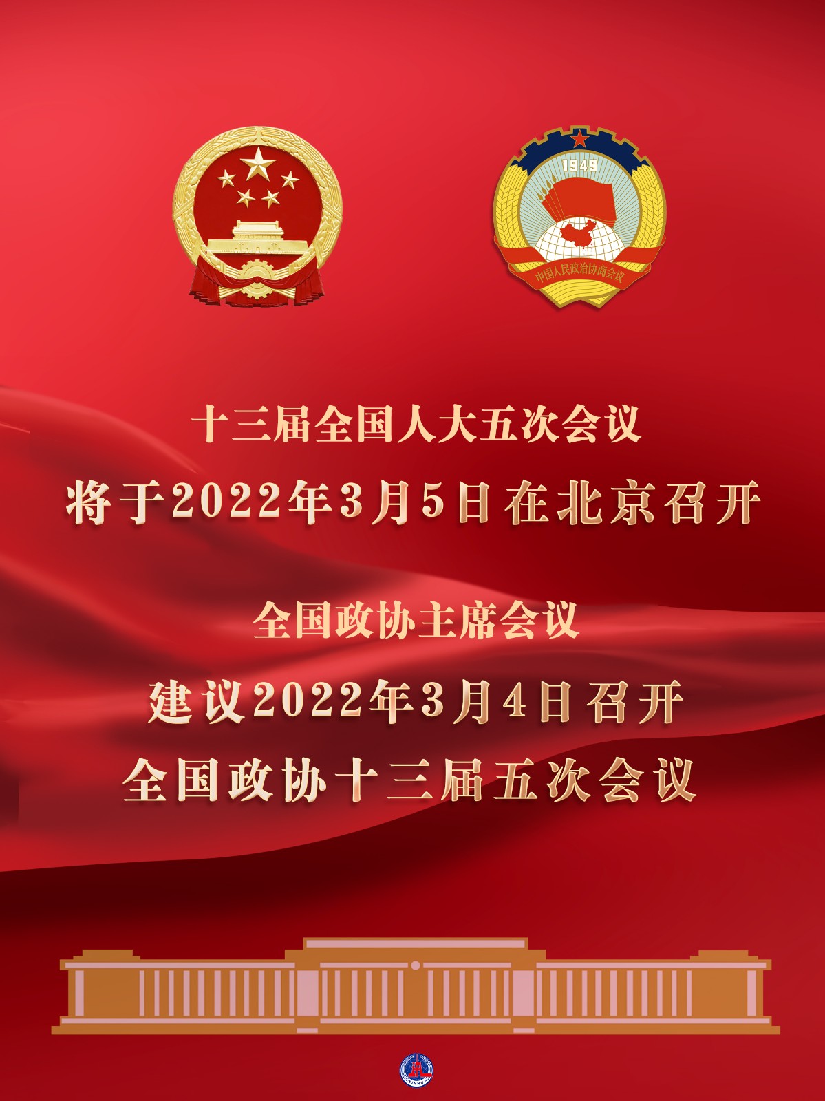 海報(bào):十三屆全國(guó)人大五次會(huì)議將于2022年3月5日在北京召開 全國(guó)政協(xié)主席會(huì)議建議2022年3月4日召開全國(guó)政協(xié)十三屆五次會(huì)議